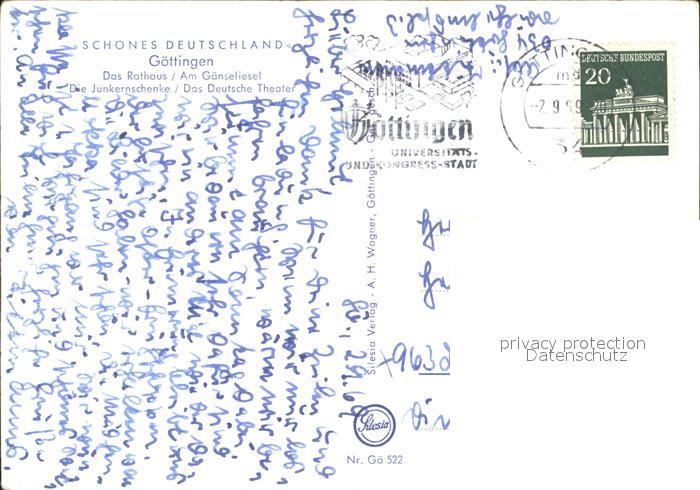 72229718 alte Postkarte Goettingen Niedersachsen Rathaus Gaenseliesel Junkernschaenke Deutsches Theater postalisch gelaufen Erhaltung siehe scans KatCode: 11110003152012