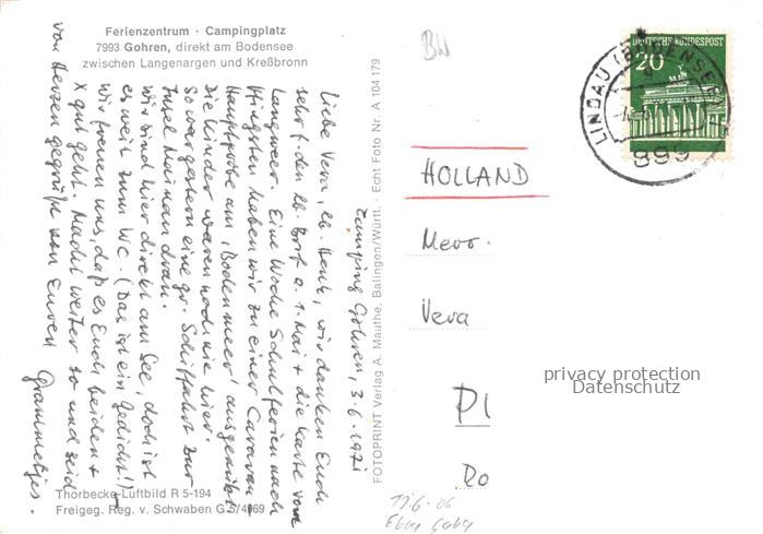 74105159 alte Postkarte Gohren Kressbronn Langenargen Bodensee BW Ferienzentrum Campingplatz postalisch gelaufen Fliegeraufnahme Erhaltung siehe scans [FriedD77] KatCode: 11110008435029