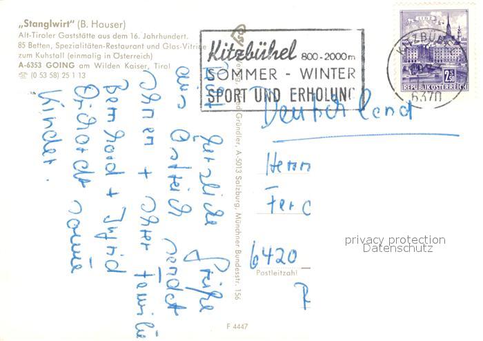 73272059 alte Postkarte Going Wilden Kaiser Tirol Alt Tiroler Gaststaette Restaurant Stanglwirt Wasserspiegelung im See postalisch gelaufen Erhaltung siehe scans [FriedD77] KatCode: 11390335070404