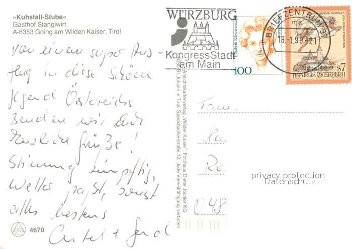 73644864 alte Postkarte Going Wilden Kaiser Tirol Kuhstall Stube Gasthof Stanglwirt Alpen postalisch gelaufen Erhaltung siehe scans [FriedD77] KatCode: 11390335070404