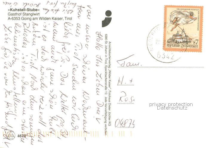 73630041 alte Postkarte Going Wilden Kaiser Tirol Kuhstall Stube Gasthof Stanglwirt Gastraeume postalisch gelaufen Erhaltung siehe scans [WerneD78] KatCode: 11390335070404