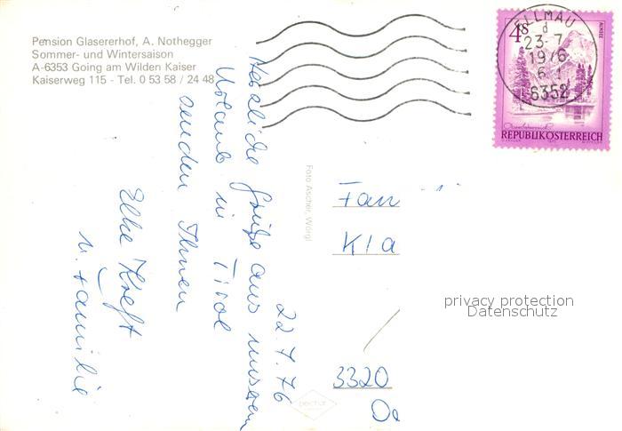 73034261 alte Postkarte Going Wilden Kaiser Tirol Pension Glasererhof postalisch gelaufen Erhaltung siehe scans [PaolaD17] KatCode: 11390335070404