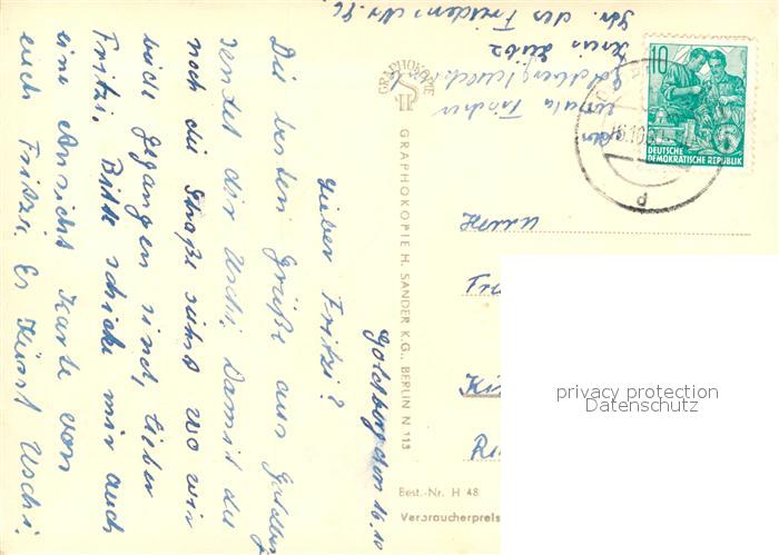 73126578 alte Postkarte Goldberg Mecklenburg Strasse des Friedens Berufsschule Badestrand Alte Windmuehle Wappen postalisch gelaufen Erhaltung siehe scans [FriedD77] KatCode: 11110013060026