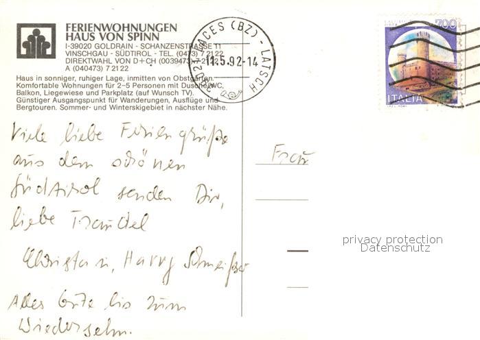 old postcard Goldrain Vinschgau Ferienwohnung Haus von Spinn postalisch gelaufen Erhaltung siehe scans [LiesaD40]