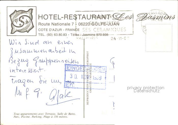 11991410 carte postale Golfe-Juan Vallauris 06 Alpes-Maritimes Hotel Restaurant Les Jasmins postalisch gelaufen Erhaltung siehe scans KatCode: 11170006106155