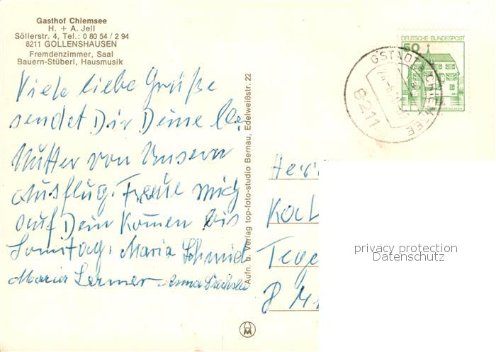 73833504 alte Postkarte Gollenshausen Chiemsee Gasthof Chiemsee Gaststube Der Wirt und seine Buam Speisesaal postalisch gelaufen Erhaltung siehe scans [WerneD78] KatCode: 11110009187138