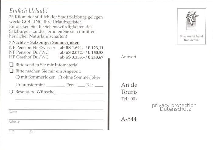 72393882 Golling Salzach postalisch nicht gelaufen Werbekarte (keine Postkarte) Erhaltung siehe scans KatCode: 11390323050204
