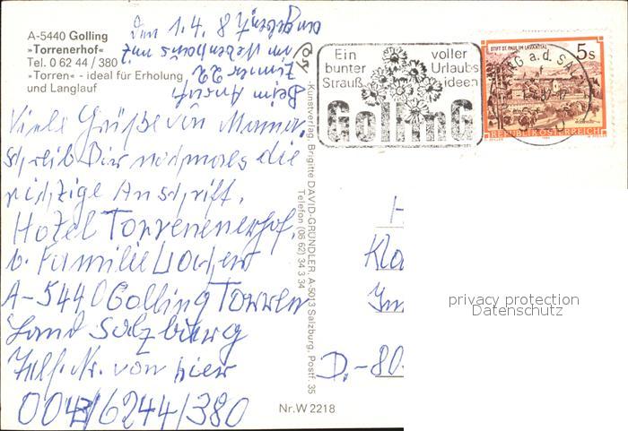 72583435 alte Postkarte Golling Salzach Torrenerhof postalisch gelaufen Erhaltung siehe scans [LiesaD40] KatCode: 11390323050204