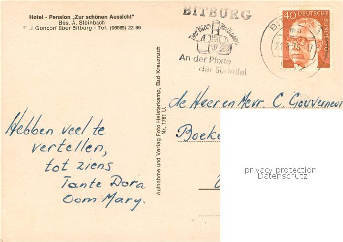73748451 alte Postkarte Gondorf Bitburg Hotel Pension Zur schoenen Aussicht Hallenbad Speiseraum postalisch gelaufen Erhaltung siehe scans [WerneD78] KatCode: 11110007232044