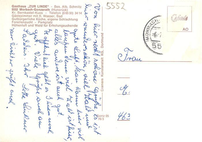 73893191 alte Postkarte Gonzerath Gasthaus Pension Zur Linde Panorama Am Forellenweiher Speiseraum Gaststube postalisch gelaufen Erhaltung siehe scans [WerneD78] KatCode: 11110007231502