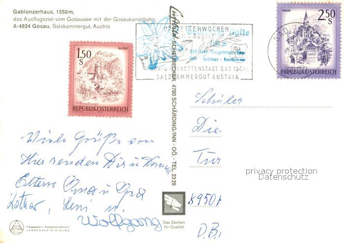 73312314 alte Postkarte Gosau Oberoesterreich Gablonzerhaus Ausflugsziel Gosausee Gosaukammbahn Dachsteingebirge postalisch gelaufen Erhaltung siehe scans [FriedD77] KatCode: 11390315040706
