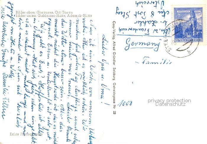 72831657 alte Postkarte Gosau Oberoesterreich Gosausee Gablonzer Huette Adamek Huette postalisch gelaufen Erhaltung siehe scans [KathaD81] KatCode: 11390315040706
