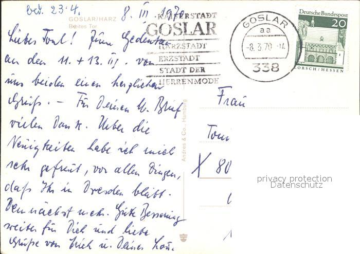 72402973 alte Postkarte GOSLAR Harz Niedersachsen Breites Tor postalisch gelaufen Erhaltung siehe scans KatCode: 11110003153005