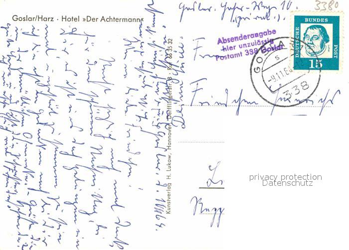 72886778 alte Postkarte Goslar Hotel Der Achtermann postalisch gelaufen Erhaltung siehe scans [WerneD78] KatCode: 11110003153005