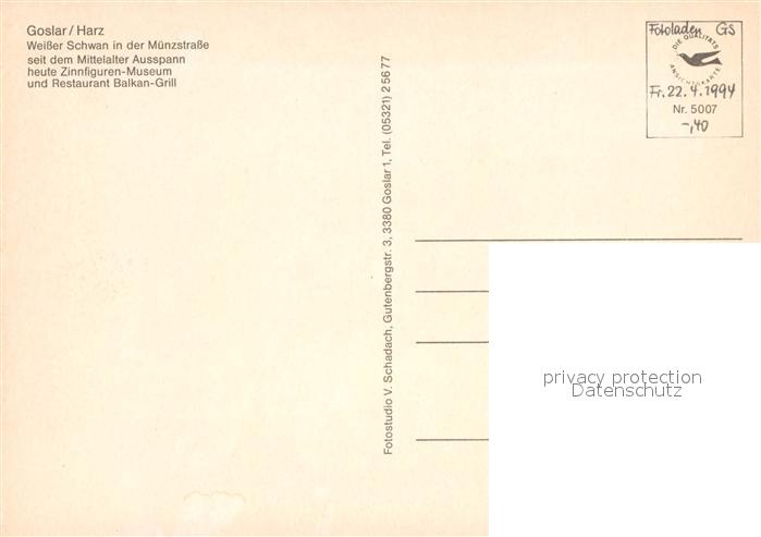 72958231 Goslar Weisser Schwan in der Muenzstrasse Zinnfiguren Museum Fachwerk Restaurant postalisch nicht gelaufen Erhaltung siehe scans [FriedD77] KatCode: 11110003153005