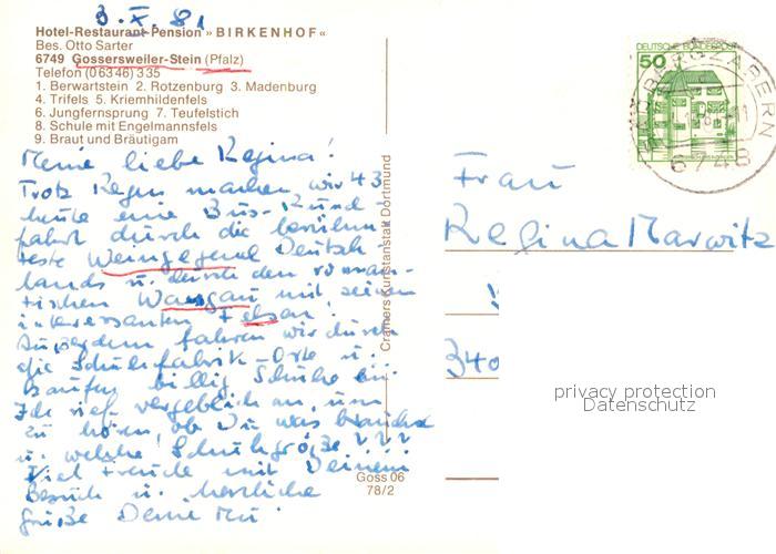 73272165 alte Postkarte Gossersweiler-Stein Hotel Restaurant Birkenhof Burgen Felsformationen Schule postalisch gelaufen Erhaltung siehe scans [FriedD77] KatCode: 11110007337033