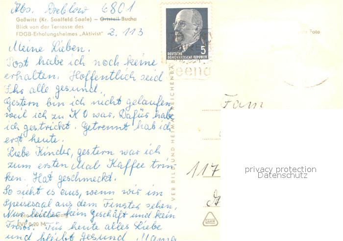 72940440 alte Postkarte Gosswitz Saalfeld Terrasse Erholungsheim Aktivist postalisch gelaufen Erhaltung siehe scans [NatalD47] KatCode: 11110016073111