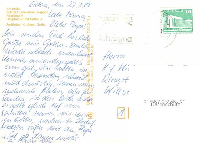 72899405 alte Postkarte Gotha Thueringen Am Bruehl Schloss Friedenstein Wappen Hauptmarkt Rathaus postalisch gelaufen Erhaltung siehe scans [AndreD76] KatCode: 11110016067029