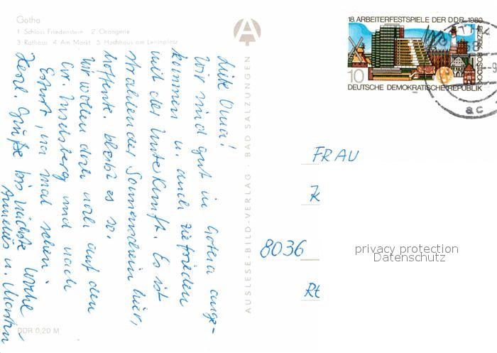 72625611 alte Postkarte Gotha Thueringen Schloss Friedenstein Orangerie Rathaus Markt Hochhaus am Leninplatz postalisch gelaufen Erhaltung siehe scans [WerneD78] KatCode: 11110016067029
