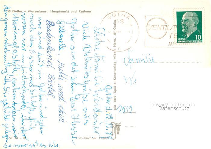 73097934 alte Postkarte Gotha Thueringen Wasserkunst Hauptmarkt und Rathaus postalisch gelaufen Erhaltung siehe scans [WerneD78] KatCode: 11110016067029