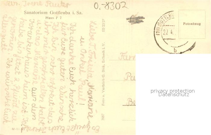 73697759 alte Postkarte Gottleuba-Berggiesshuebel Bad Sanatorium Haus F 7 postalisch gelaufen Erhaltung siehe scans [LiesaD40] KatCode: 11110014287015