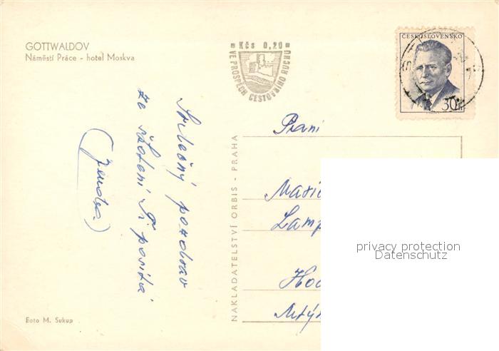 13341114 old postcard Gottwaldov Tschechien Namesti Prace Hotel Moskva postalisch gelaufen Erhaltung siehe scans [WerneD78] KatCode: 11520