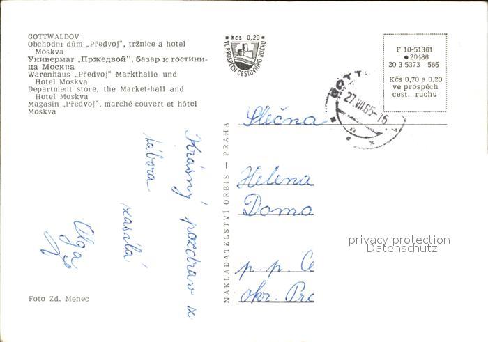 old postcard Gottwaldov Tschechien Obhodni dum Predvoj trznice a hotel Moskva postalisch gelaufen Erhaltung siehe scans