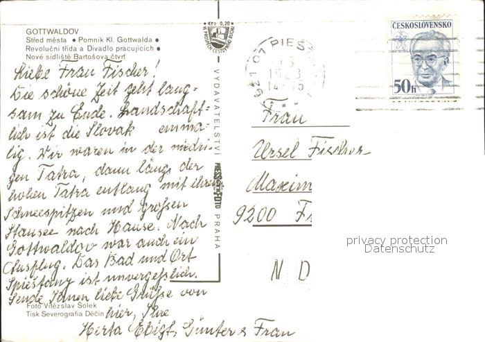old postcard Gottwaldov Tschechien Stred mesta Pomnik Kl Gotwalda Revolucni trida a Divadlo pracujicich Nove sidliste Bartosova ctv rt postalisch gelaufen Erhaltung siehe scans