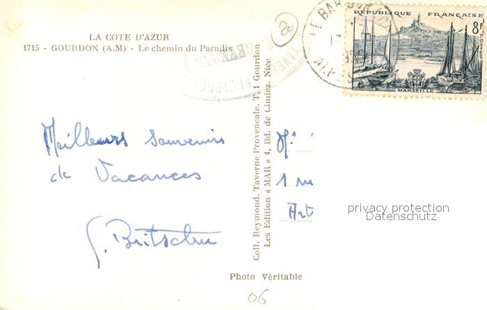 13493008 carte postale Gourdon Alpes-Maritimes Le chemin du Paradis Paysage Alpes postalisch gelaufen Erhaltung siehe scans [FriedD77] KatCode: 11170006106068