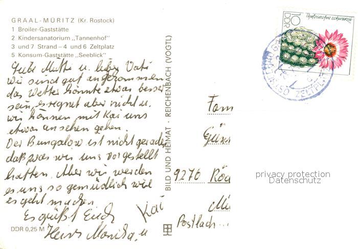 73317829 alte Postkarte Graal-Mueritz Ostseebad Broiler Gaststaette Sanatorium Strand Zeltplatz Konsum Gaststaette Seeblick postalisch gelaufen Erhaltung siehe scans [FriedD77] KatCode: 11110013051022