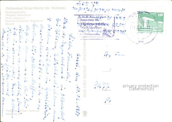 72382520 alte Postkarte Graal-Mueritz Ostseebad Broilergaststaette Zeltplatz Uhlenflucht Hotel Seestern postalisch gelaufen Erhaltung siehe scans KatCode: 11110013051022