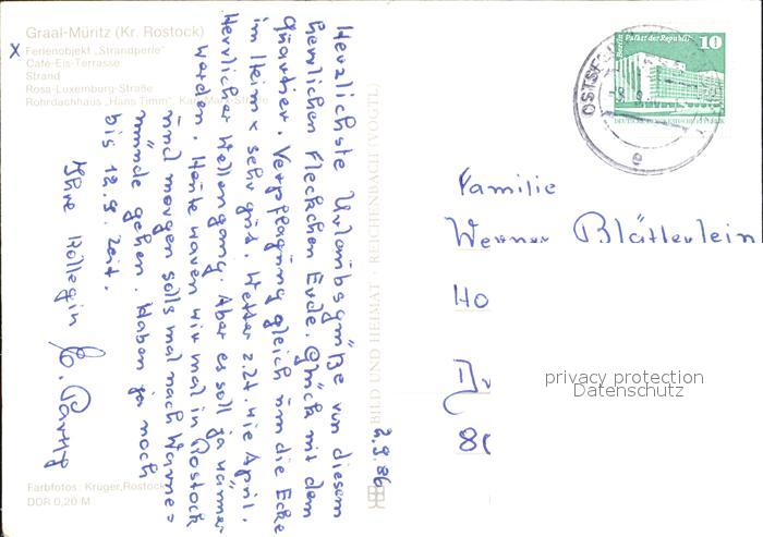 72407874 alte Postkarte Graal-Mueritz Ostseebad Ferienobjekt Strandperle Cafe Eis Terrasse Strand Rosa Luxemburg Strasse Rohrdachhaus Karl Marx Strasse postalisch gelaufen Erhaltung siehe scans KatCode: 11110013051022