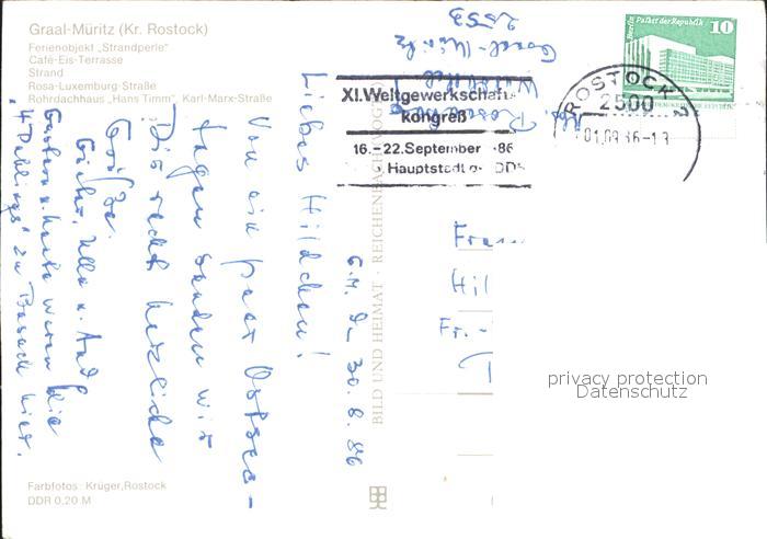 72297361 alte Postkarte Graal-Mueritz Ostseebad Ferienobjekt Strandperle Terrasse Strand Rosa Luxemburg Strasse Rohrdachhaus Ostseebad postalisch gelaufen Erhaltung siehe scans KatCode: 11110013051022