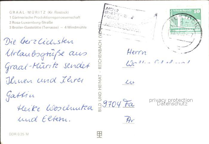 72350880 alte Postkarte Graal-Mueritz Ostseebad Gaernerische Produktionsgenossenschaft Rosa Luxemburg Strasse Broiler Gaststaette Windmuehle postalisch gelaufen Erhaltung siehe scans KatCode: 11110013051022