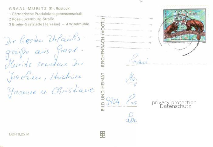 72704309 alte Postkarte Graal-Mueritz Ostseebad Gaertner Produktionsgenossenschaft Rosa Luxemburg Str Broiler Gaststaette Windmuehle postalisch gelaufen Erhaltung siehe scans [FriedD77] KatCode: 11110013051022