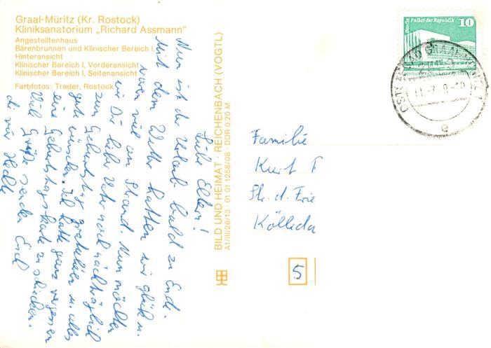 73884606 alte Postkarte Graal-Mueritz Ostseebad Kliniksanatorium Richard Assmann Angestelltenhaus Baerenbrunnen Klinischer Bereich I Vorder und Seitenansicht postalisch gelaufen Erhaltung siehe scans [WerneD78] KatCode: 11110013051022