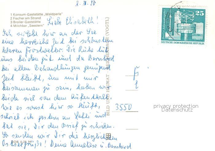 73777579 alte Postkarte Graal-Mueritz Ostseebad Konsum Gaststaette Waldperle Fischer Broiler Gaststaette Milchbar Seestern postalisch gelaufen Erhaltung siehe scans [FriedD77] KatCode: 11110013051022