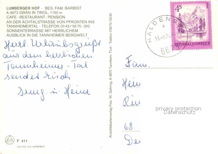 72760985 alte Postkarte Graen Tirol Cafe Restaurant Lumberger Hof Panorama Tannheimer Alpen Pferde postalisch gelaufen Erhaltung siehe scans [FriedD77] KatCode: 11390331070811