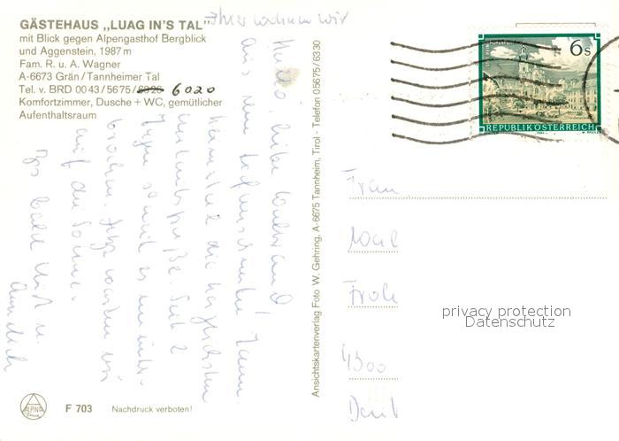 13189419 alte Postkarte Graen Tirol Gaestehaus Luag in’s Tal postalisch gelaufen Erhaltung siehe scans [PaolaD17] KatCode: 11390331070811