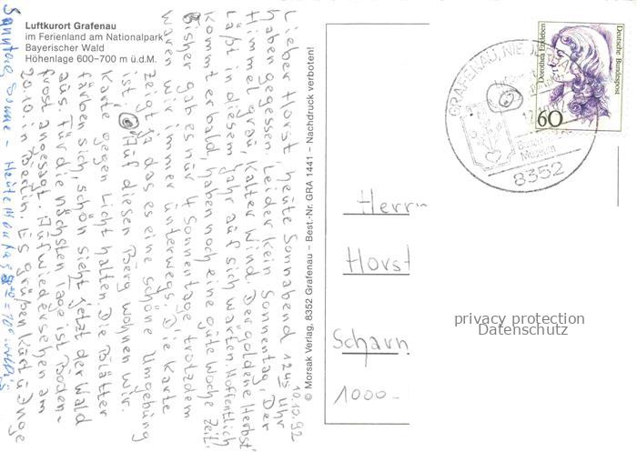 74023850 alte Postkarte Grafenau Niederbayern Panorama Luftkurort im Ferienland am Nationalpark Bayerischer Wald postalisch gelaufen Fliegeraufnahme Erhaltung siehe scans [FriedD77] KatCode: 11110009272120