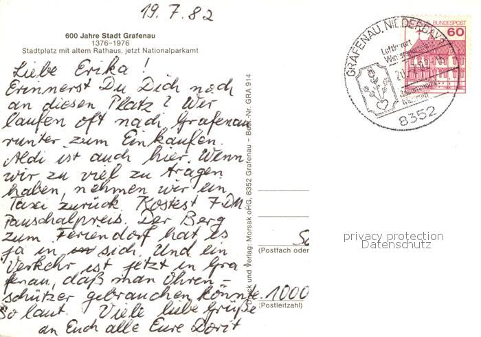 72991506 alte Postkarte Grafenau Niederbayern Stadtplatz mit altem Rathaus jetzt Nationalparkamt postalisch gelaufen Erhaltung siehe scans [LiesaD40] KatCode: 11110009272120