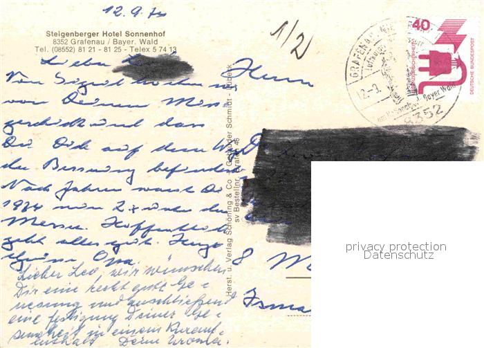 72659545 alte Postkarte Grafenau Niederbayern Steigenberger Hotel Sonnenhof postalisch gelaufen Erhaltung siehe scans [NatalD47] KatCode: 11110009272120