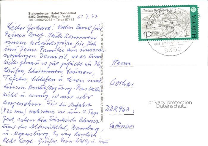 72504553 alte Postkarte Grafenau Niederbayern Steigenberger Hotel Sonnenhof postalisch gelaufen Erhaltung siehe scans KatCode: 11110009272120