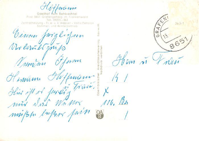 73881579 alte Postkarte Grafengehaig Gasthaus zum Rehbachtal postalisch gelaufen Erhaltung siehe scans [WerneD78] KatCode: 11110009477117