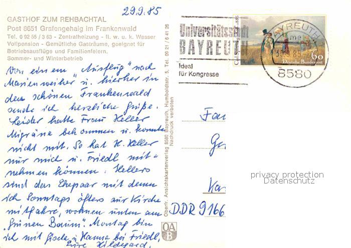72641469 alte Postkarte Grafengehaig Gasthof zum Rehbachtal Frankenwald Rehkitz postalisch gelaufen Erhaltung siehe scans [FriedD77] KatCode: 11110009477117