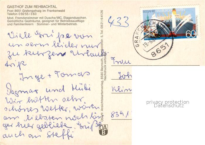 73716133 alte Postkarte Grafengehaig Gasthof zum Rehbachtal Gaststube Gartenterrasse postalisch gelaufen Erhaltung siehe scans [WerneD78] KatCode: 11110009477117
