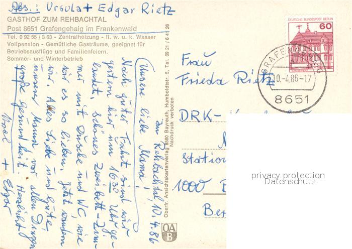 73785712 alte Postkarte Grafengehaig Gasthof zum Rehbachtal Rehkitz postalisch gelaufen Erhaltung siehe scans [WerneD78] KatCode: 11110009477117
