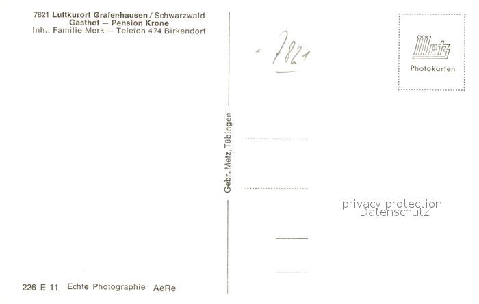 42941059 Grafenhausen Schwarzwald Gasthof Pension Krone postalisch nicht gelaufen Erhaltung siehe scans [AndreD76] KatCode: 11110008337039