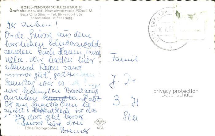 72197704 alte Postkarte Grafenhausen Schwarzwald Hotel- Pension Schluchtmuehle postalisch gelaufen Erhaltung siehe scans KatCode: 11110008337039