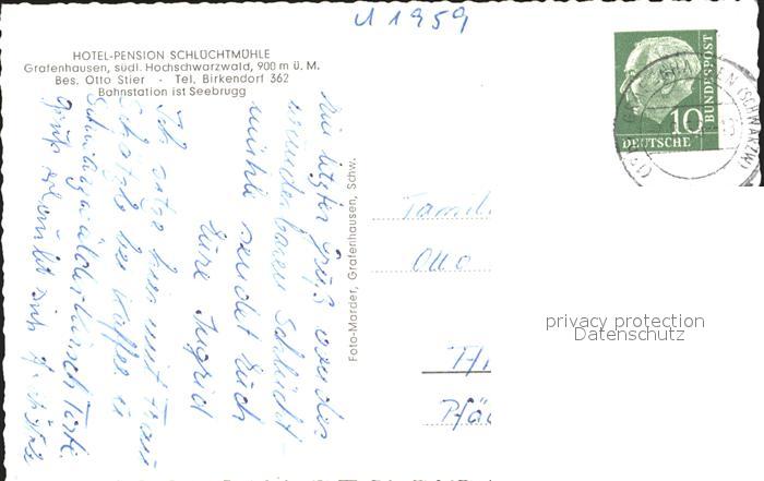 72102268 alte Postkarte Grafenhausen Schwarzwald Hotel Pension Schluechtmuehle postalisch gelaufen Erhaltung siehe scans KatCode: 11110008337039